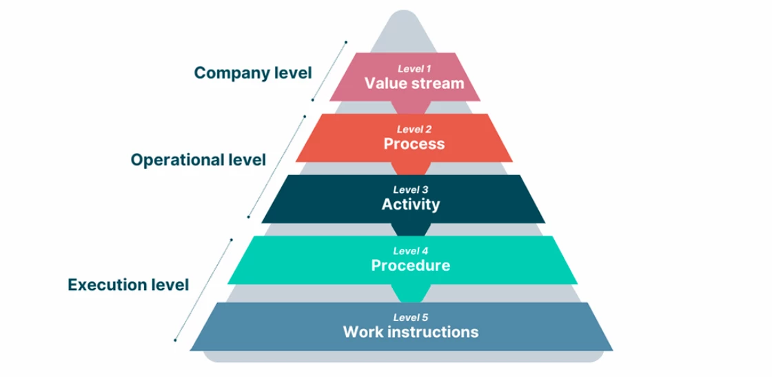 Level 3: More granular elements that contribute to the overall process, with a specific scope and specific tasks or activities associated. Examples: Purchase Order processing, Invoicing