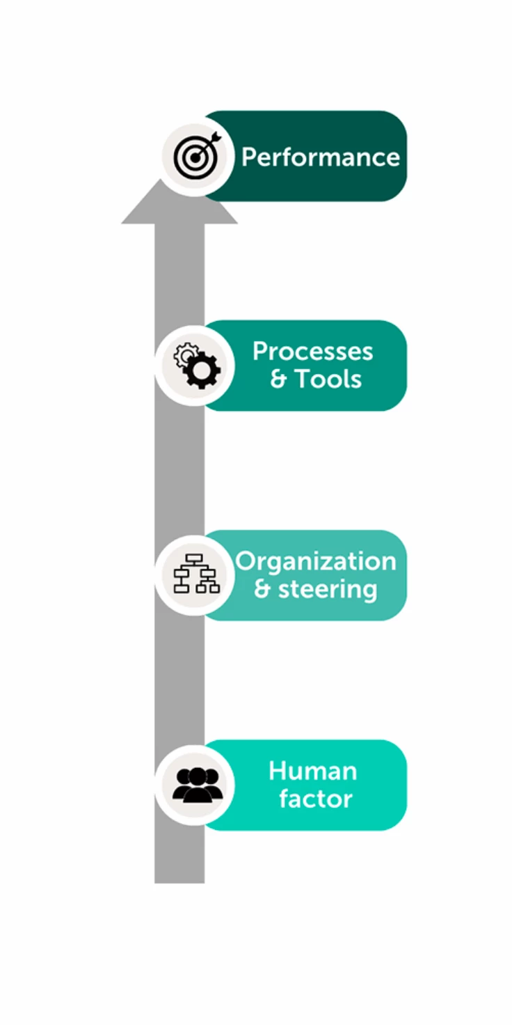 We can leverage our off-the-shelf process library (maturity grids, sets of KPIs, etc.) as a starting point and customize them to your specific needs.