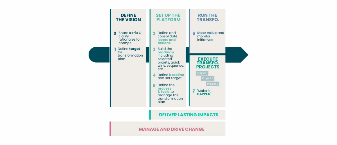 Successful transformation relies on a shared vision and structured Transformation Program governance allowing fast decision making, customized approach, and transverse coordination across the entire organization.